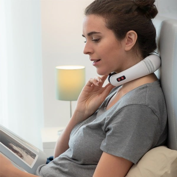 Descubre nuestro nuevo masajeador que masajea en profundidad a través de eficaces impulsos electromagnéticos de baja frecuencia. Gracias a su forma y sus electrodos adicionales actúa en los puntos clave del cuello, cervicales y espalda, proporcionando una agradable sensación de bienestar.